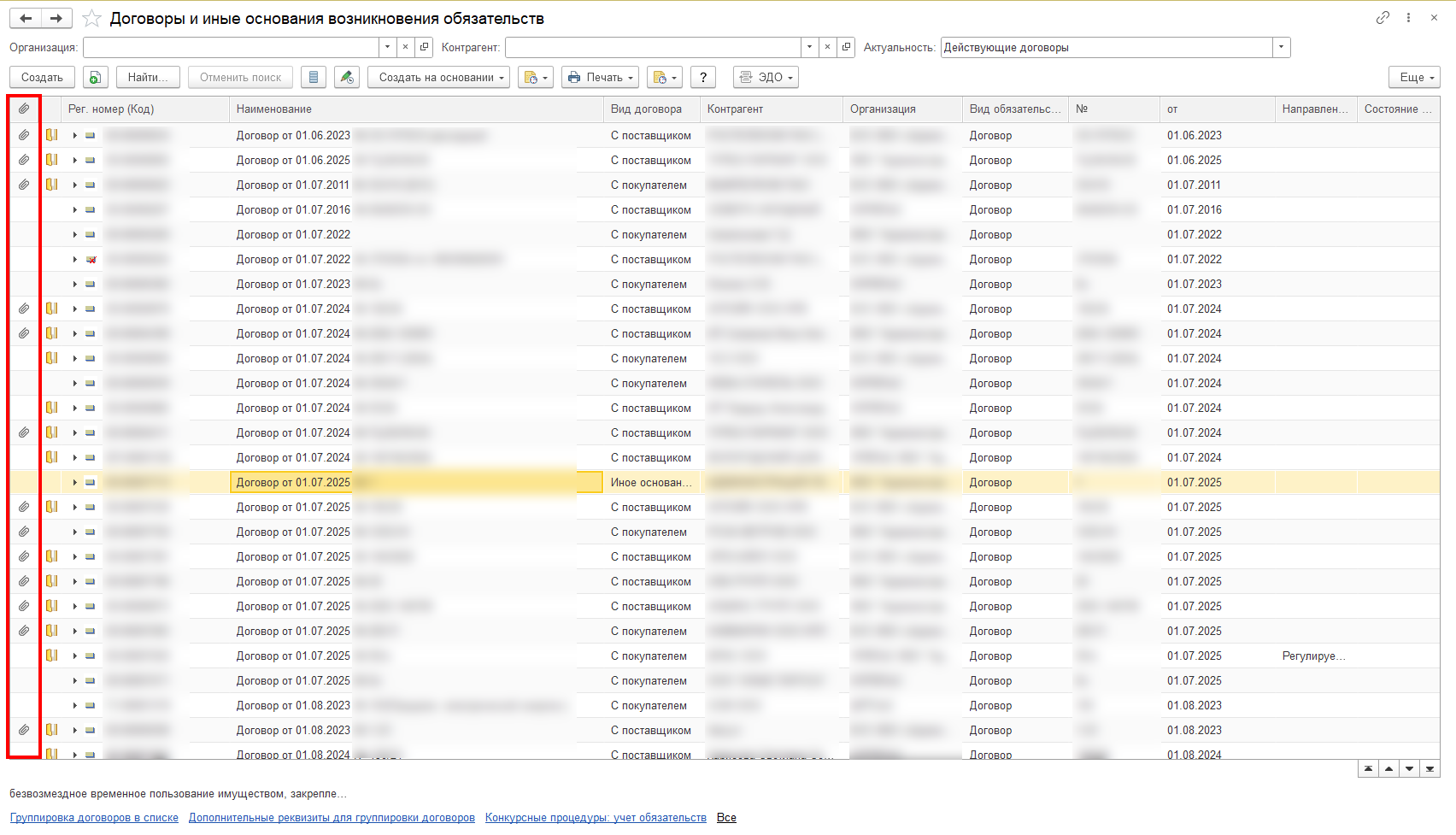 Если файлы уже присоединены в справочнике или в документе, то в самой первой колонке списков и журналов появляется специальный знак: Скрепка.