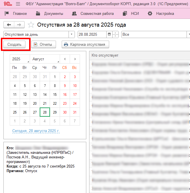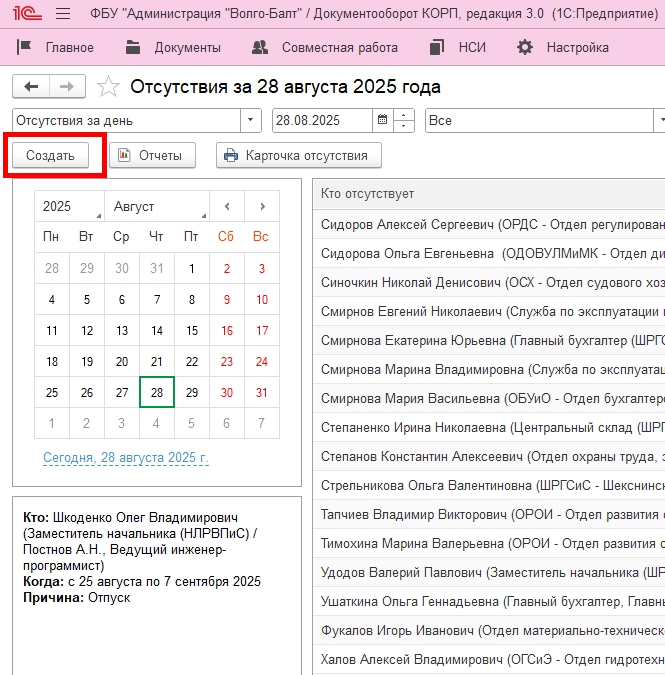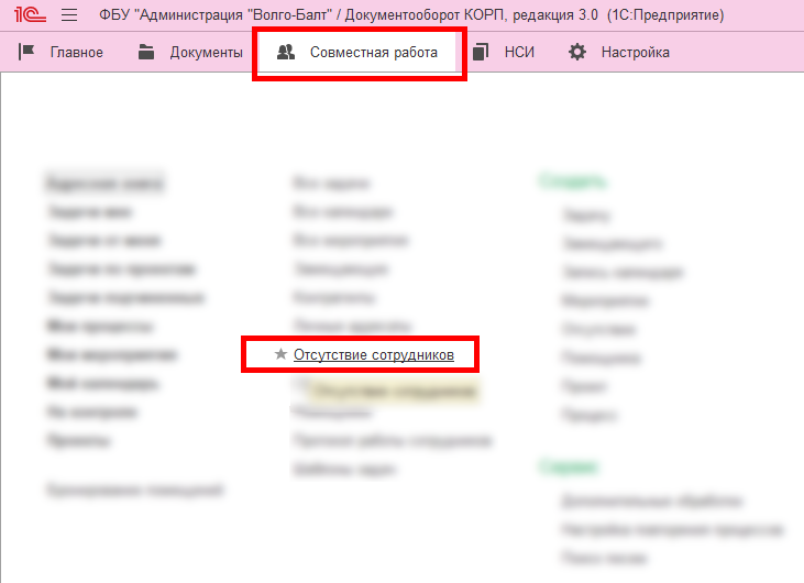 1. Если необходимо посмотреть или создать отсутствие сотрудника, зайдите в меню Совместная работа -> Отсутствие сотрудников.