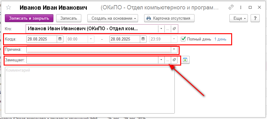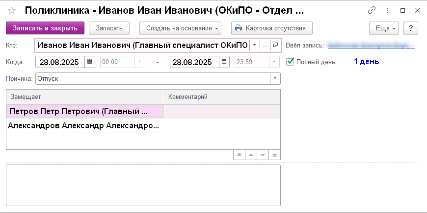 В карточке замещения, созданного на основании отсутствия, отображается реквизит "Основание". При этом реквизиты "Период" и "Сотрудник" автоматически обновляются из отсутствия и недоступны для редактирования.