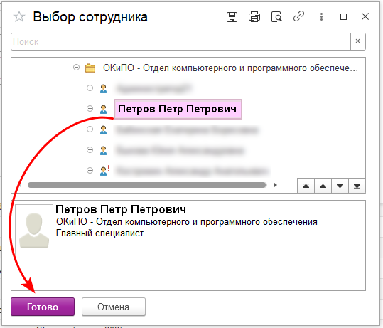 4. После нажатия на Еще (три точки) у реквизита "Замещает", появится окно "Выбор сотрудника". Выберите из списка сотрудника и нажмите "Готово".