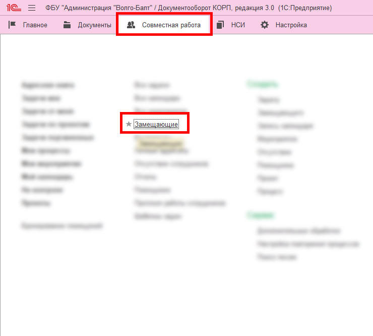 Чтобы увидеть всех замещающих, необходимой зайти в меню Совместная работа -> Замещающие.