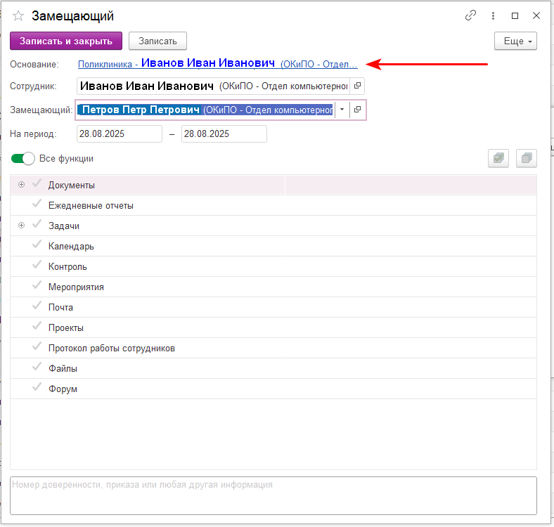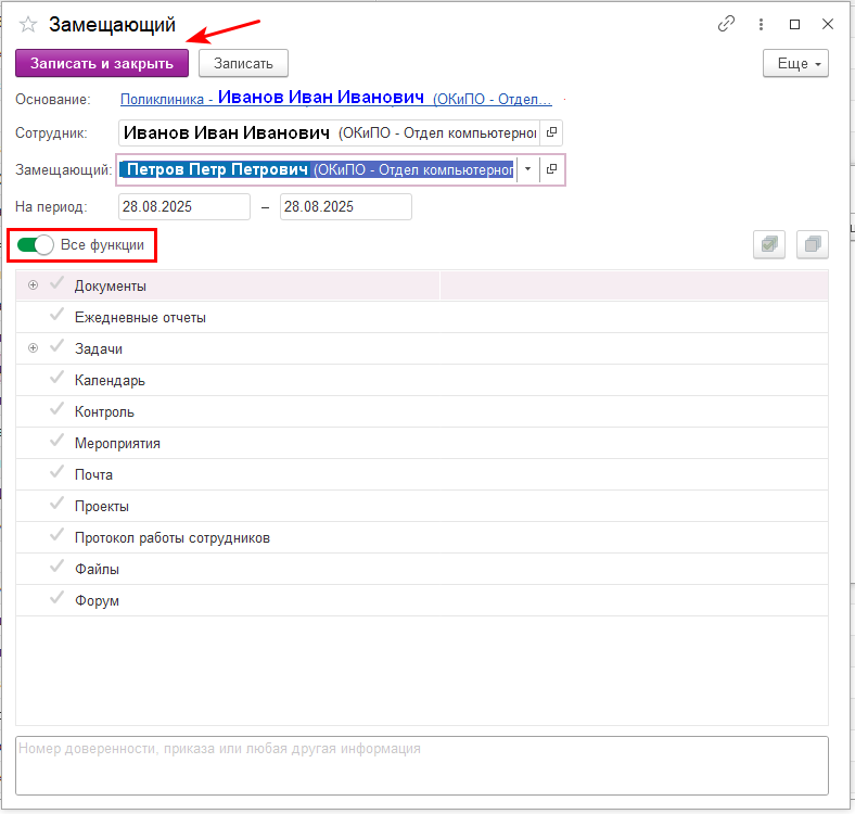 4.Откроется окно "Замещающий". В нем по умолчанию отмечены все функции: документы, задачи и так далее. Если нужно, снимите галочку "Все функции" и уберите отметки у нужных опций. Затем нажмите "Записать и закрыть".