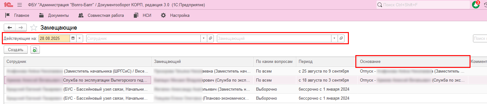 Откроется список всех замещающих на сегодняшний день. Также реквизит "Основание" отображается в общем списке. Здесь можно отфильтровать список по другой дате, по отсутствующему сотруднику и по замещающему.