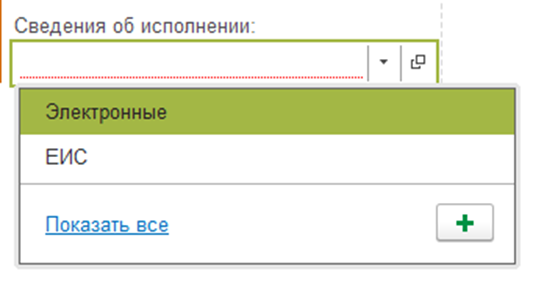 - Если поле Аванс «нет», то обязательно заполняется поле «Сведения об исполнении» (Электронные/Бумажные/Нет (аванс))