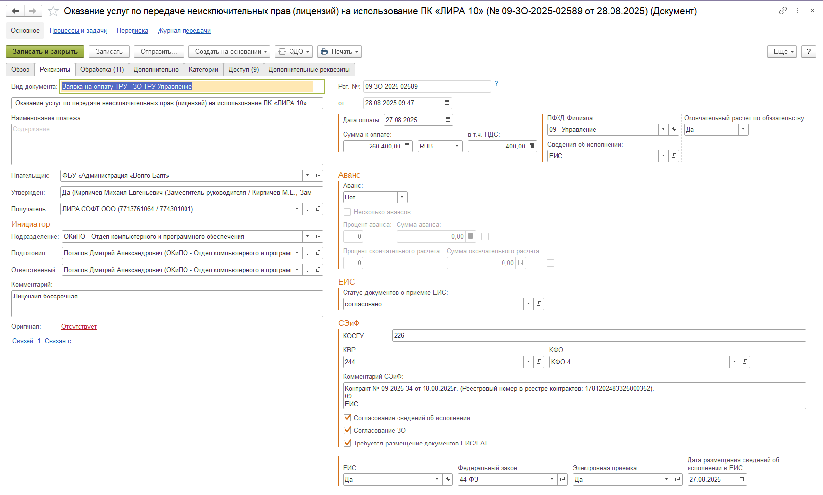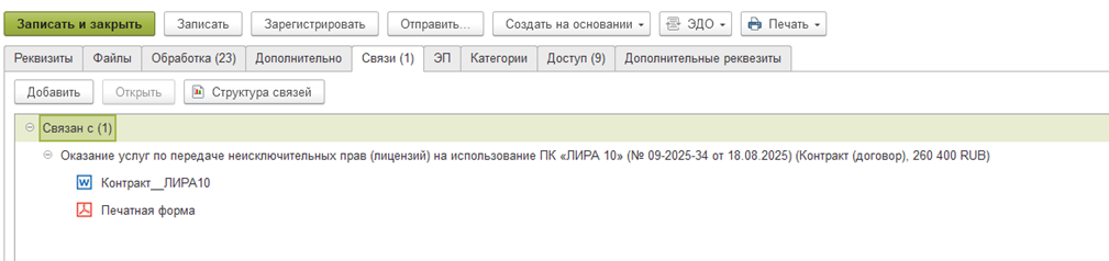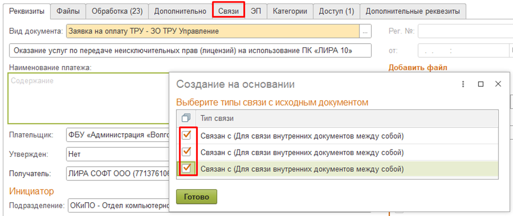 - добавить связь с обязательством (договором, контрактом, счетом (если закупка по счету без заключения договора/контракта));