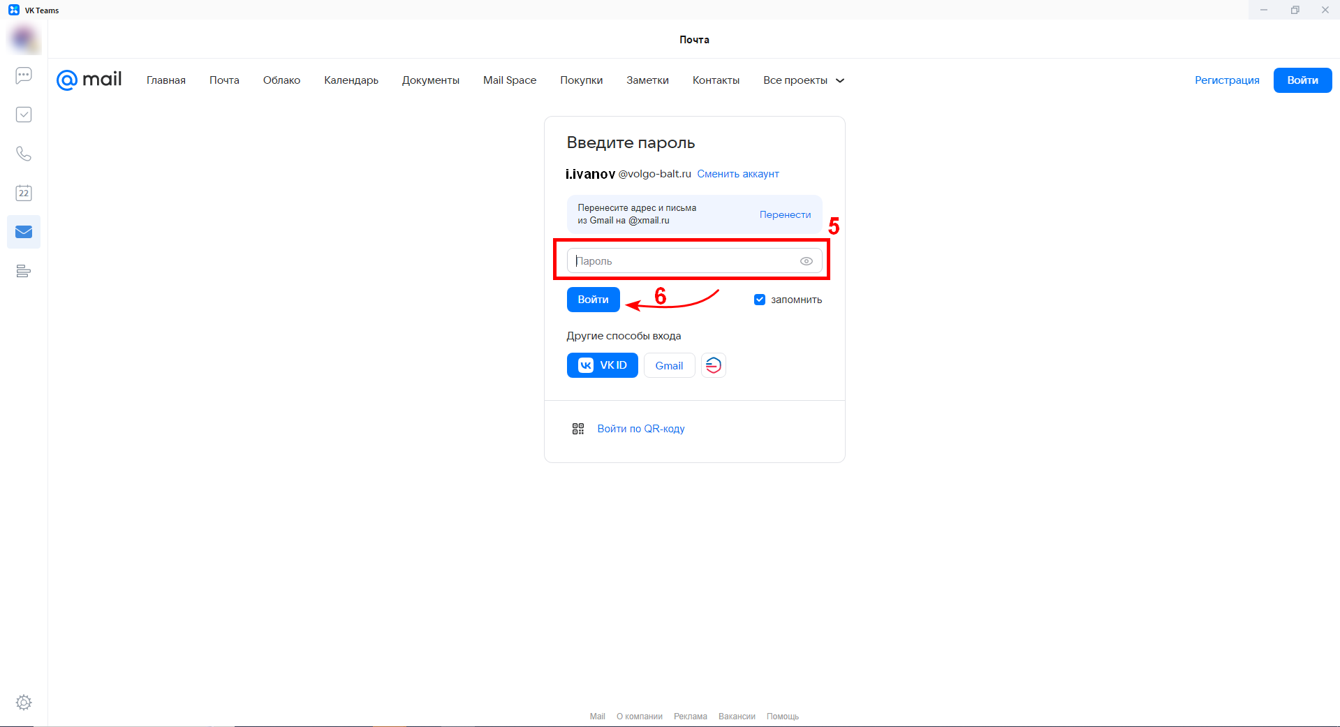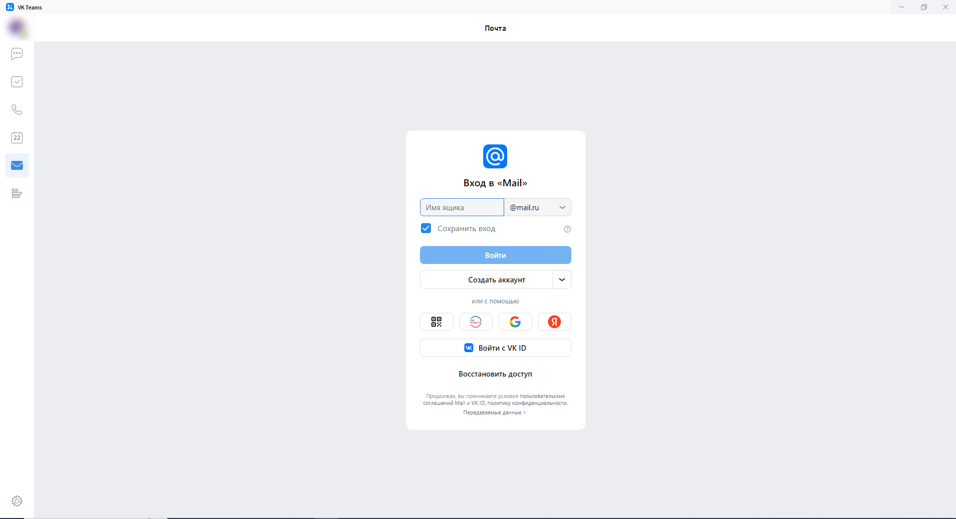 При первом открытии Почты или Календаря, потребуется дополнительно авторизоваться в почтовых сервисах через форму Mail.ru. Для этого необходимо указать корпоративные адрес электронной почты и пароль.