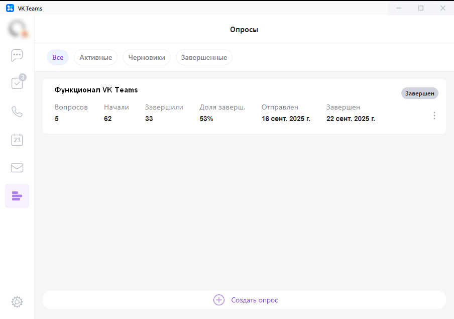 Создавайте опросы, чтобы получать обратную связь от пользователей инсталляции. Опросы могут быть анонимными или неанонимными. Проходить опросы могут все пользователи. Результаты опроса можно выгрузить в XLSX-файл, то есть в таблицу Microsoft Excel.