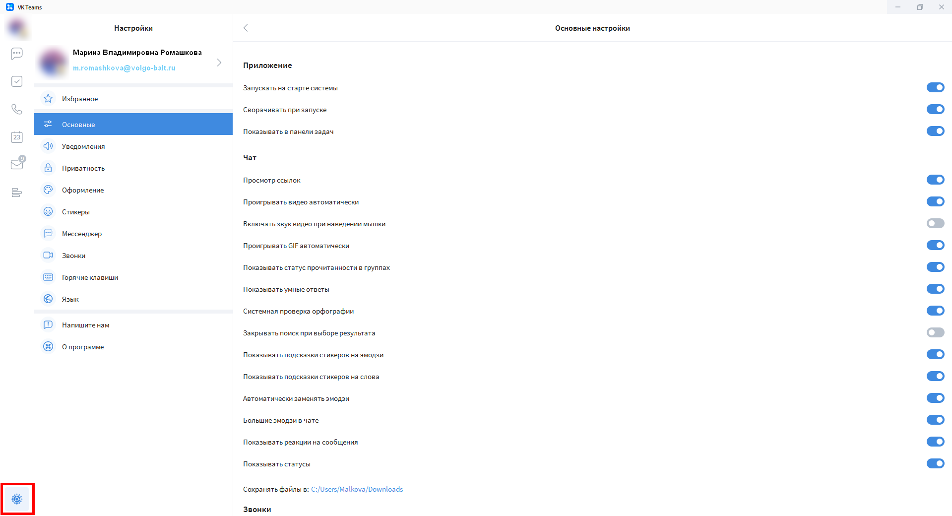 Меню настроек вызывается кликом по иконке шестеренки  в левом нижнем углу окна приложения. Раздел позволяет изменить настройки приложения, уведомлений, оформления и приватности. Подробнее читайте по ссылке.