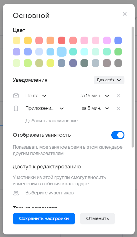 Для редактирования настроек уже созданного календаря, необходимо навести курсор на его название во вкладке Личные и кликнуть на иконку настроек. При необходимости можно предоставить доступ другим пользователям к просмотру или редактированию календаря. Подробнее читайте по ссылке.