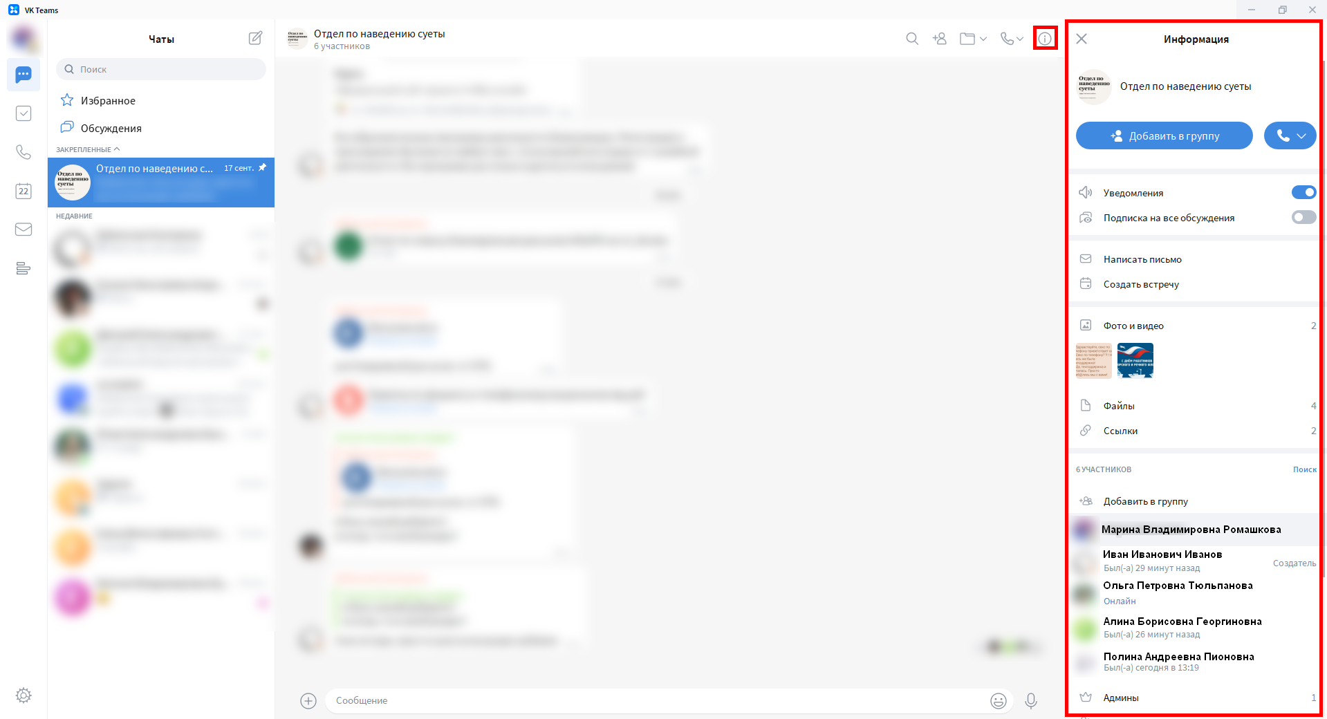 3. Дополнительные инструменты: позволяют осуществлять поиск сообщений или вложений, посмотреть галерею чата: фото и видео, файлы, ссылки,  а также начать звонок с выбранным контактом или в выбранной группе, просматривать информацию о выбранном чате.