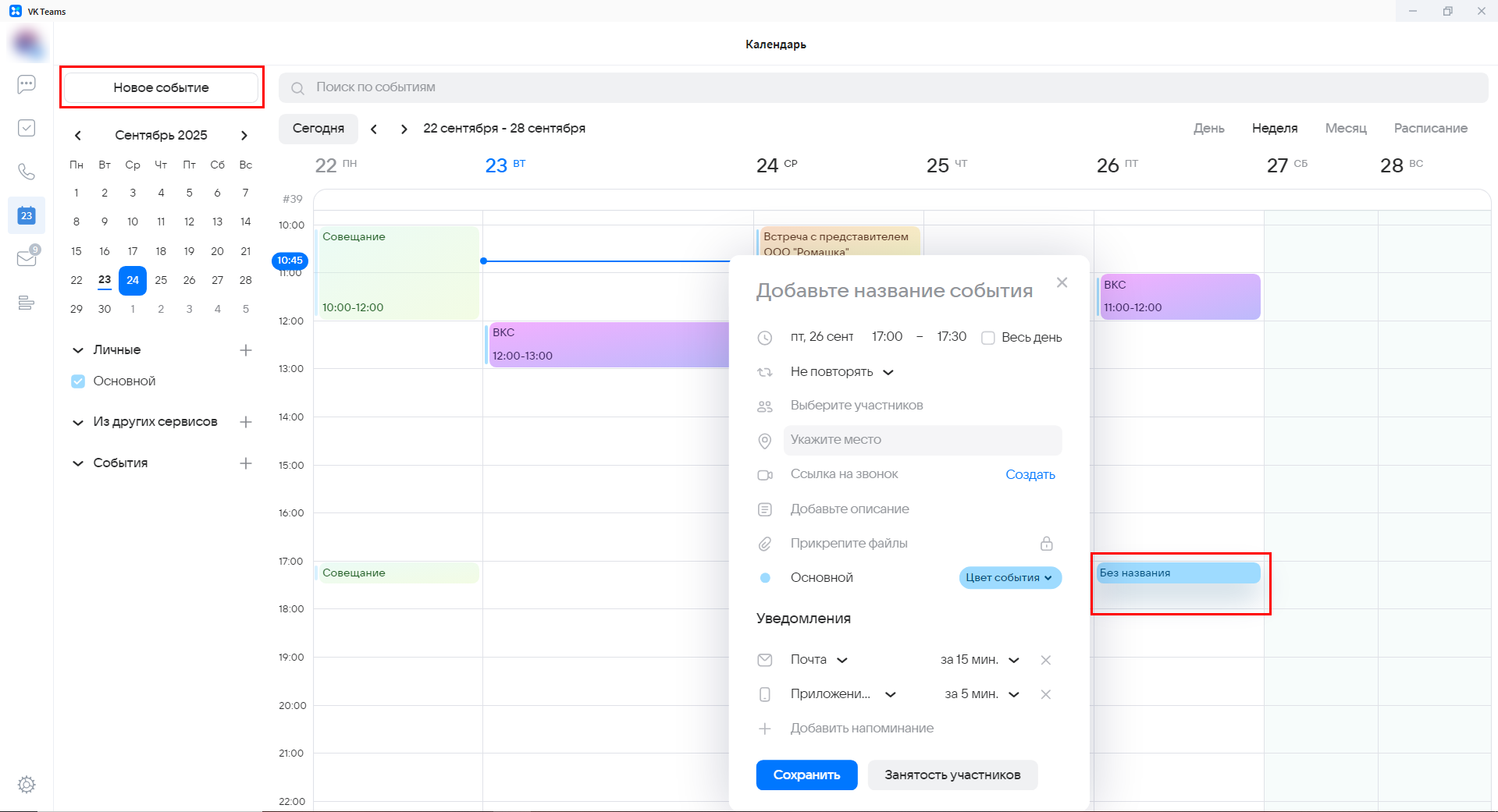 Для создания события требуется нажать кнопку "Новое событие" слева вверху, либо кликнуть по любому свободному полю в Календаре.