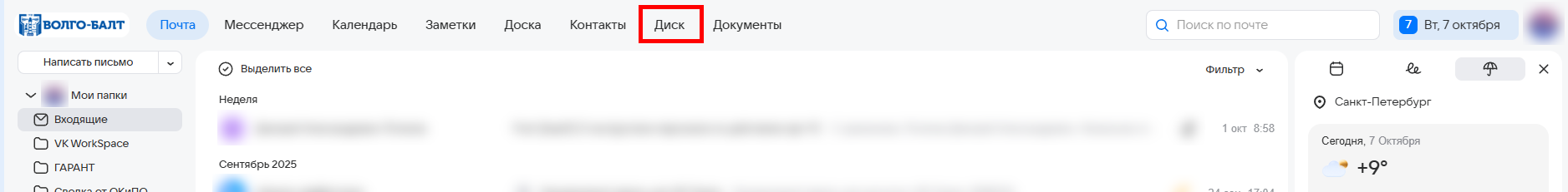 На верхней панели почты нажмите на Диск: