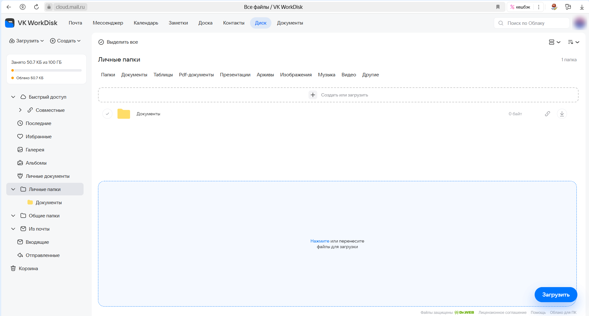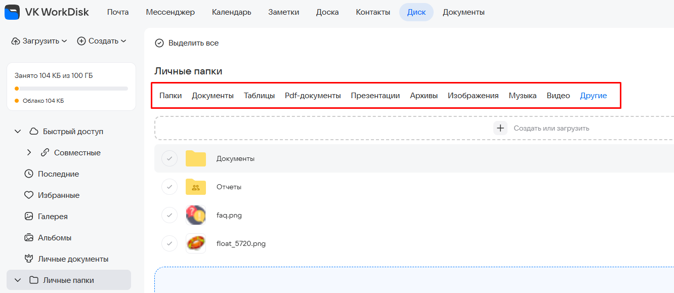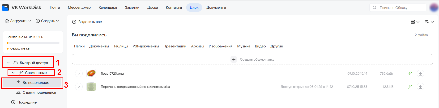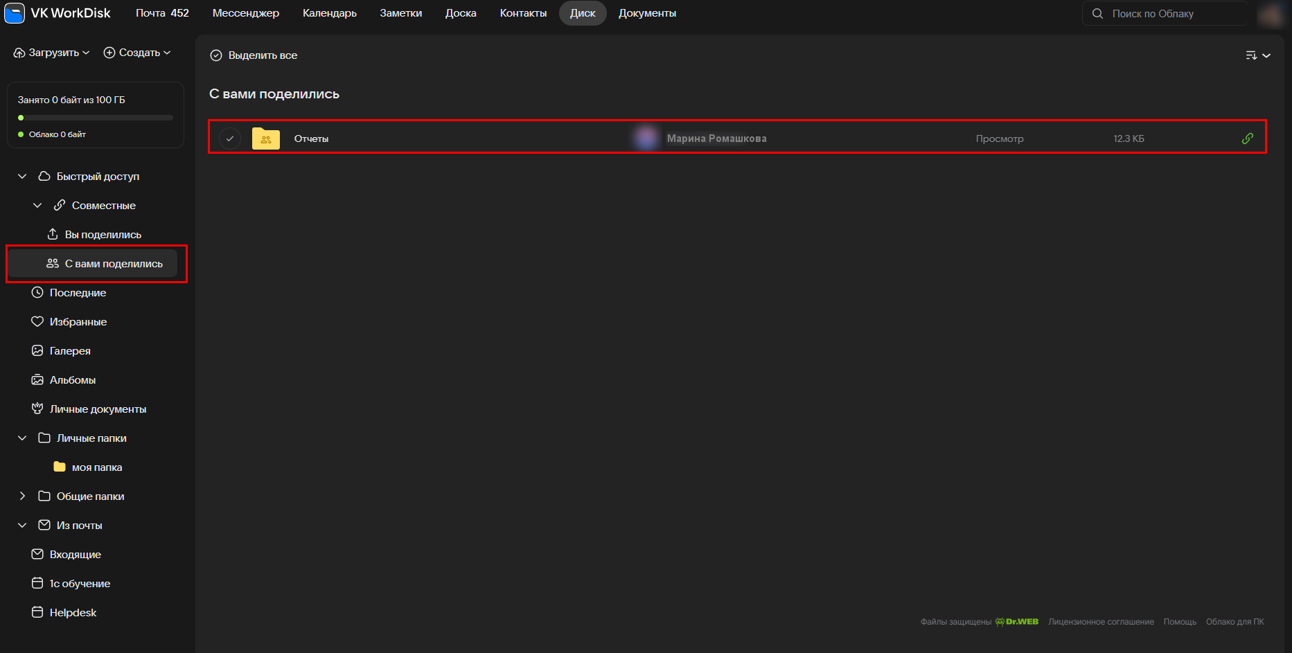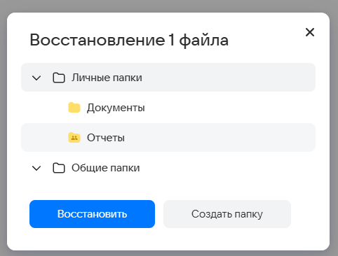 Кроме того, вам может быть предоставлен доступ в общие папки — это папки вашей организации (доступ предоставляет администратор).