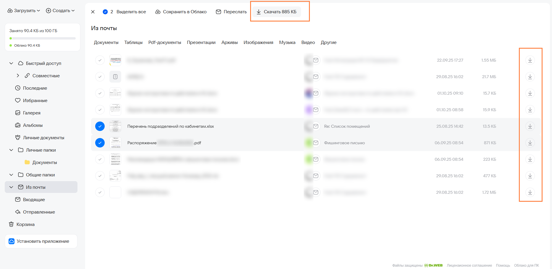 Чтобы скачать несколько файлов сразу, зажмите клавишу Shift или Ctrl на клавиатуре и выделите нужные файлы. Затем нажмите Скачать в верхнем меню.