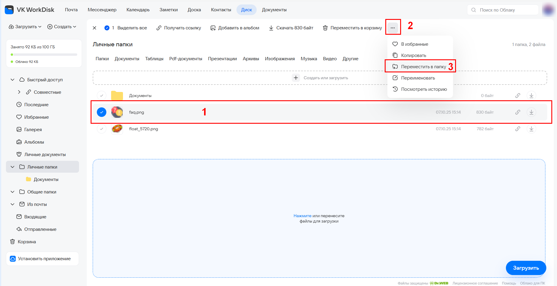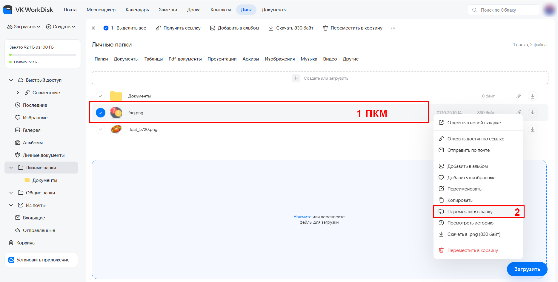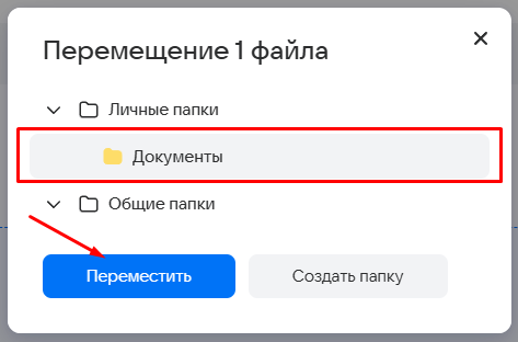 Чтобы переместить файл, наведите курсор на файл, нажмите правую кнопку мыши и выберите Переместить в папку (если нужно переместить несколько файлов сразу, выделите их, зажав клавишу Shift или Ctrl на клавиатуре).