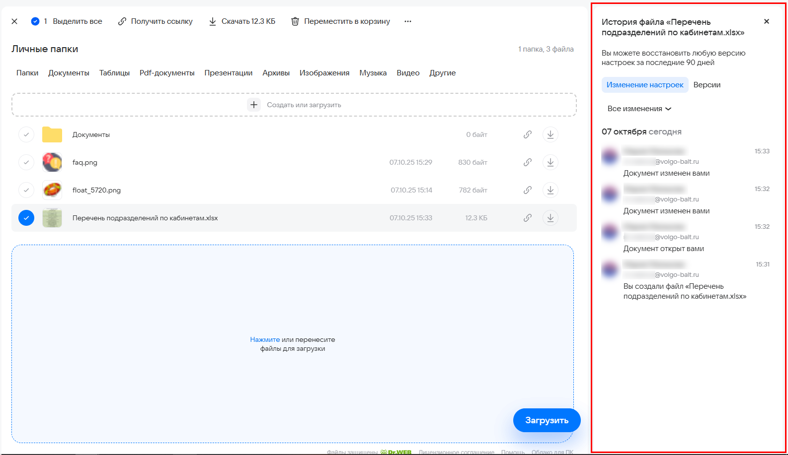 В истории показаны все последние сохраненные версии файла, а также изменения настроек, связанные с файлом или папкой. Вы можете перезаписать