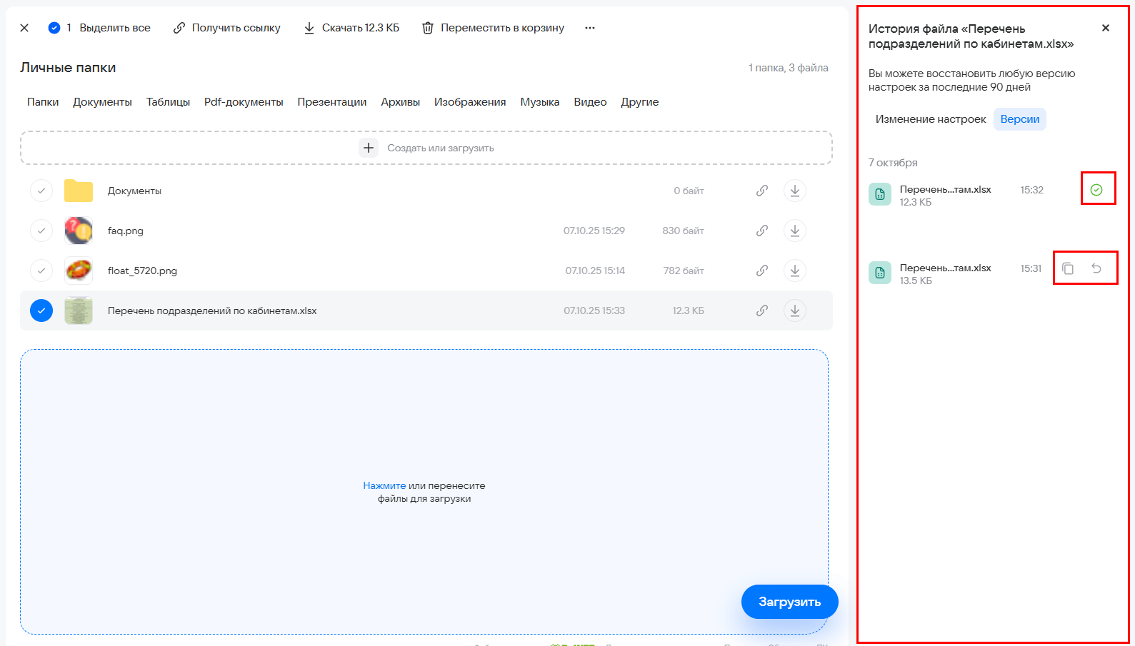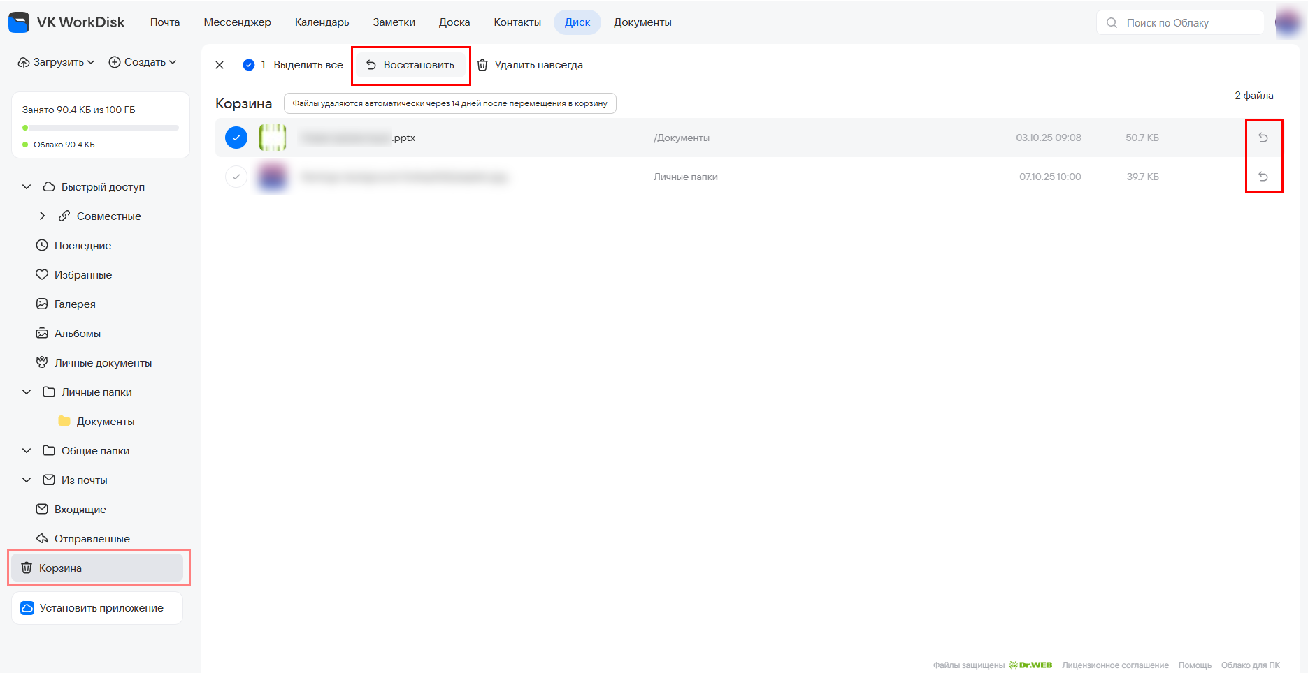 Удаленные файлы перемещаются в папку «Корзина» и хранятся там 14 дней с момента удаления. Чтобы восстановить файлы и папки: