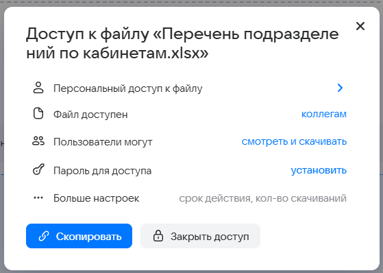 Наведите курсор мыши на файл и нажмите на значок .Откроется окно настройки доступа к файлу: