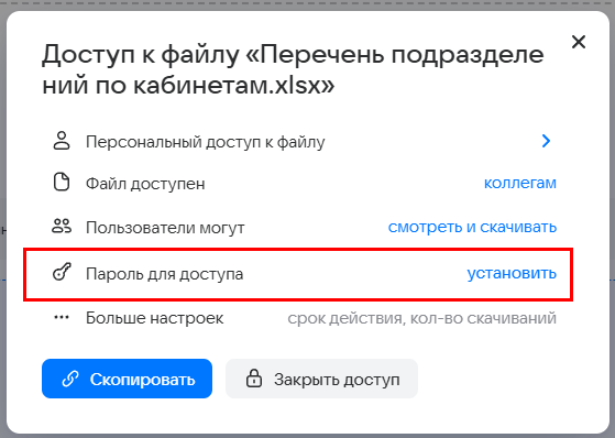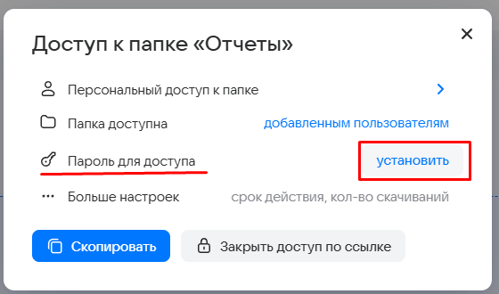 2. В блоке Пароль для доступа по ссылке нажмите Установить.