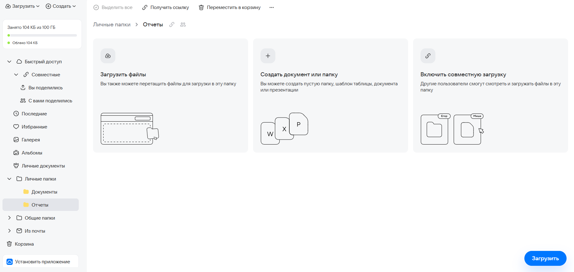 В облаке вы можете создавать папки для личного и совместного пользования. Например, вы можете организовывать групповую работу над проектом или пополнять совместную папку с учебными материалами.