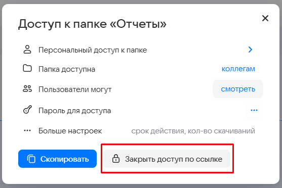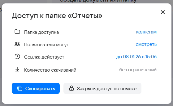 Вы можете поделиться с коллегами не только отдельными файлами, но и всей папкой. Для этого наведите курсор на папку и нажмите . Откроется окно настройки доступа к папке: