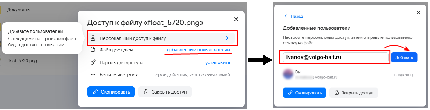 Выберите, кому будет доступен файл (всем пользователям, только вашим коллегам или добавленным пользователям). Если выбираете доступ для добавленных пользователей, то нажмите Персональный доступ к файлу и добавьте туда пользователей.