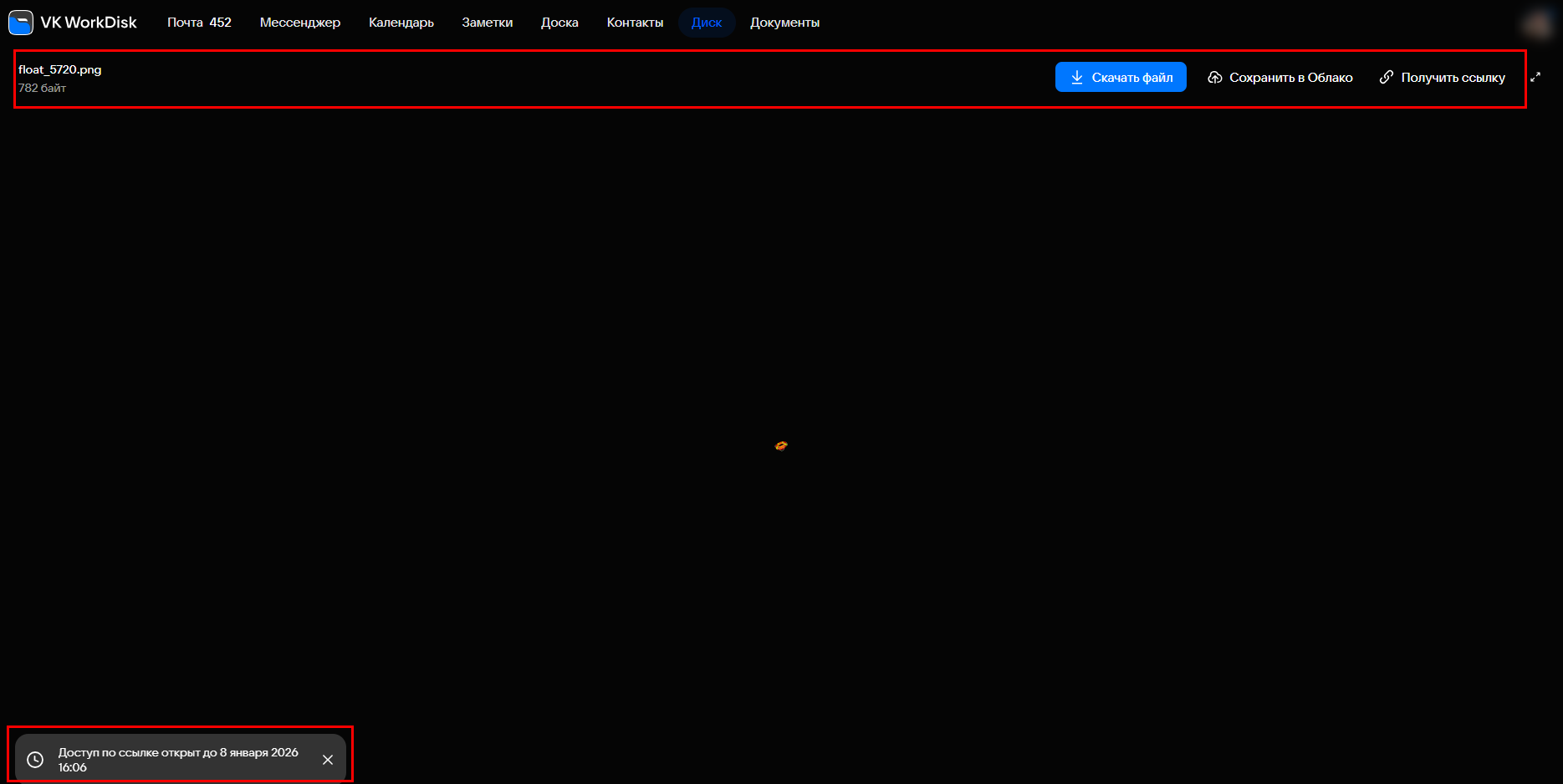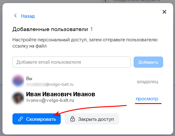Далее нажмите на кнопку Скопировать для копирования ссылки на файл, после чего отправьте (вставьте с помощью кнопок Ctrl+V) ее добавленному пользователю для предоставления доступа к файлу.