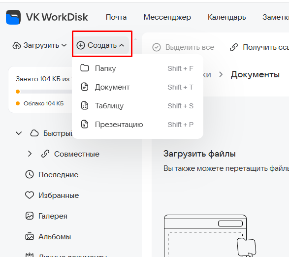 Нажмите Создать. В выпадающем списке выберите необходимый тип файла: документ, таблицу или презентацию.