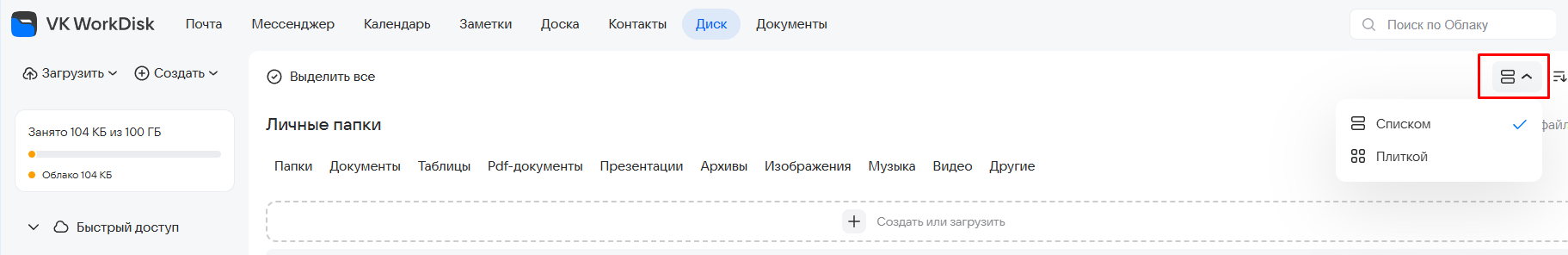 Вы можете настроить нужный способ сортировки файлов и папок в облаке, а также выводить их списком или таблицей. Чтобы изменить вид отображения файлов, кликните по иконке и выберите «Списком» или «Плиткой».