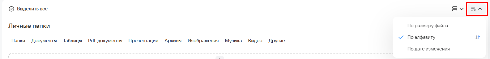 Чтобы изменить сортировку, нажмите на значок и выберите способ сортировки — по алфавиту, размеру файла или дате изменения.