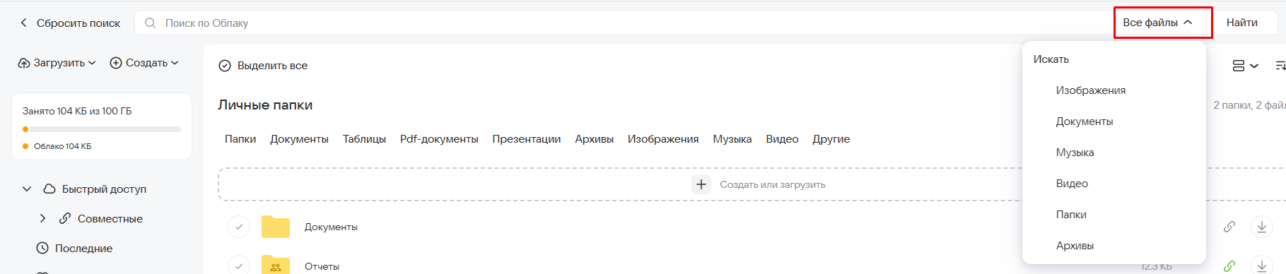 Если файлов и папок в облаке много, и вы не можете найти нужный объект, воспользуйтесь поиском по облаку.