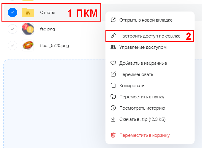 Нажмите на папку правой кнопкой мыши и выберите Настроить доступ по ссылке.