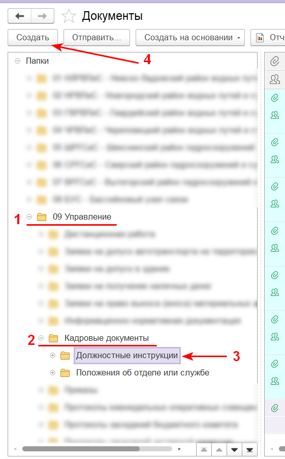 Откройте папку "09 Управление" -> "Кадровые документы" -> "Должностные инструкции". После этого нажмите на кнопку "Создать".