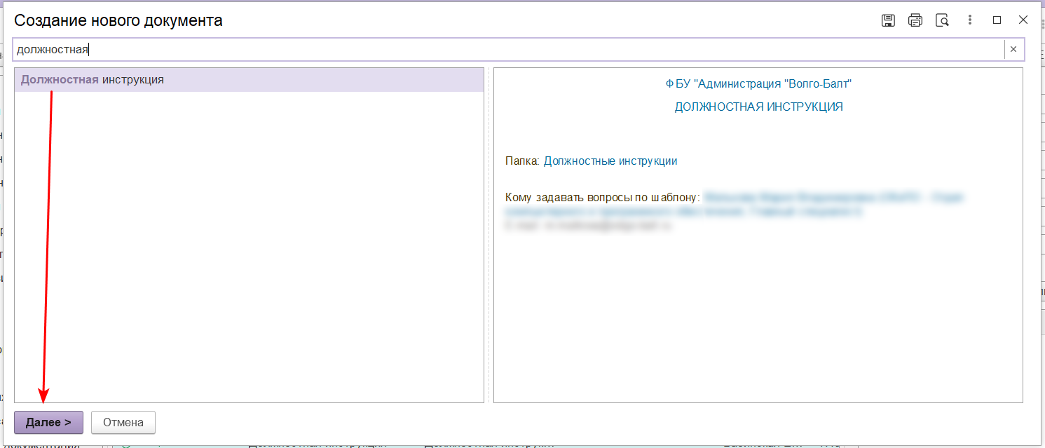 2. В открывшемся окне введите в поисковую строку "должностная", выберите "Должностная инструкция", нажмите "Далее".