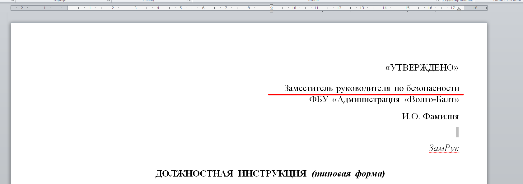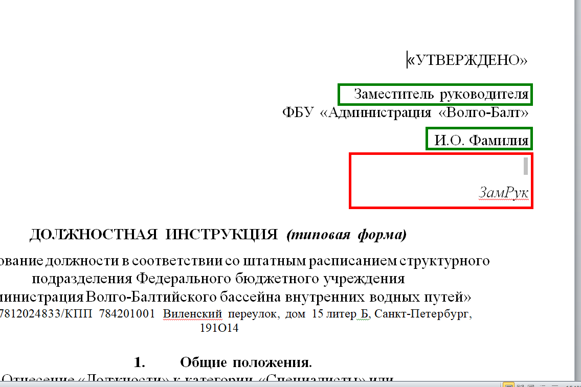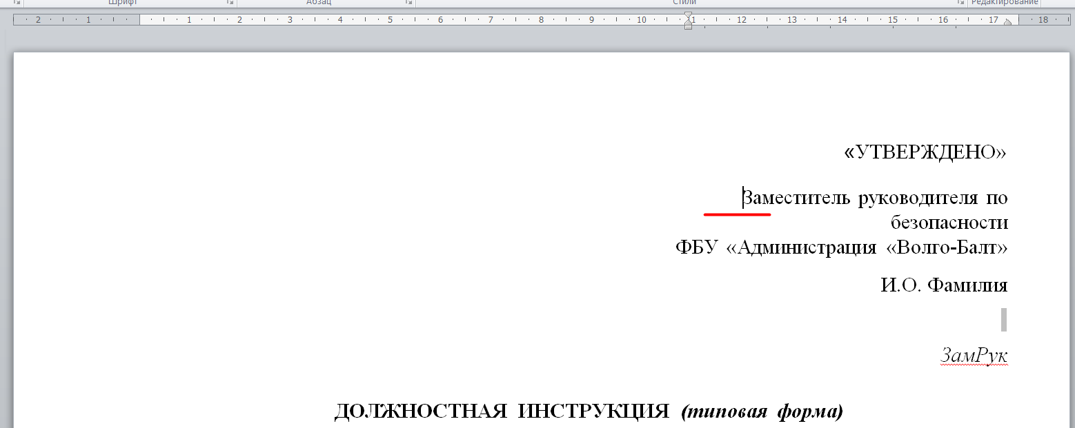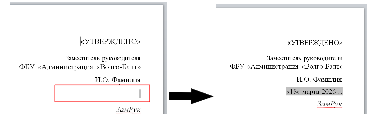 В открывшемся файле в шапке документа можете изменить должность и ФИО. НЕЛЬЗЯ изменять предпоследнюю строку, так как в нее после этапа утверждения автоматически вставится дата. Также НЕЛЬЗЯ изменять последнюю строку, так как вместо "ЗамРук" после завершения подписания всеми участниками при первом открытии файла будет вставлен штамп визуализации электронной подписи курирующего заместителя руководителя.