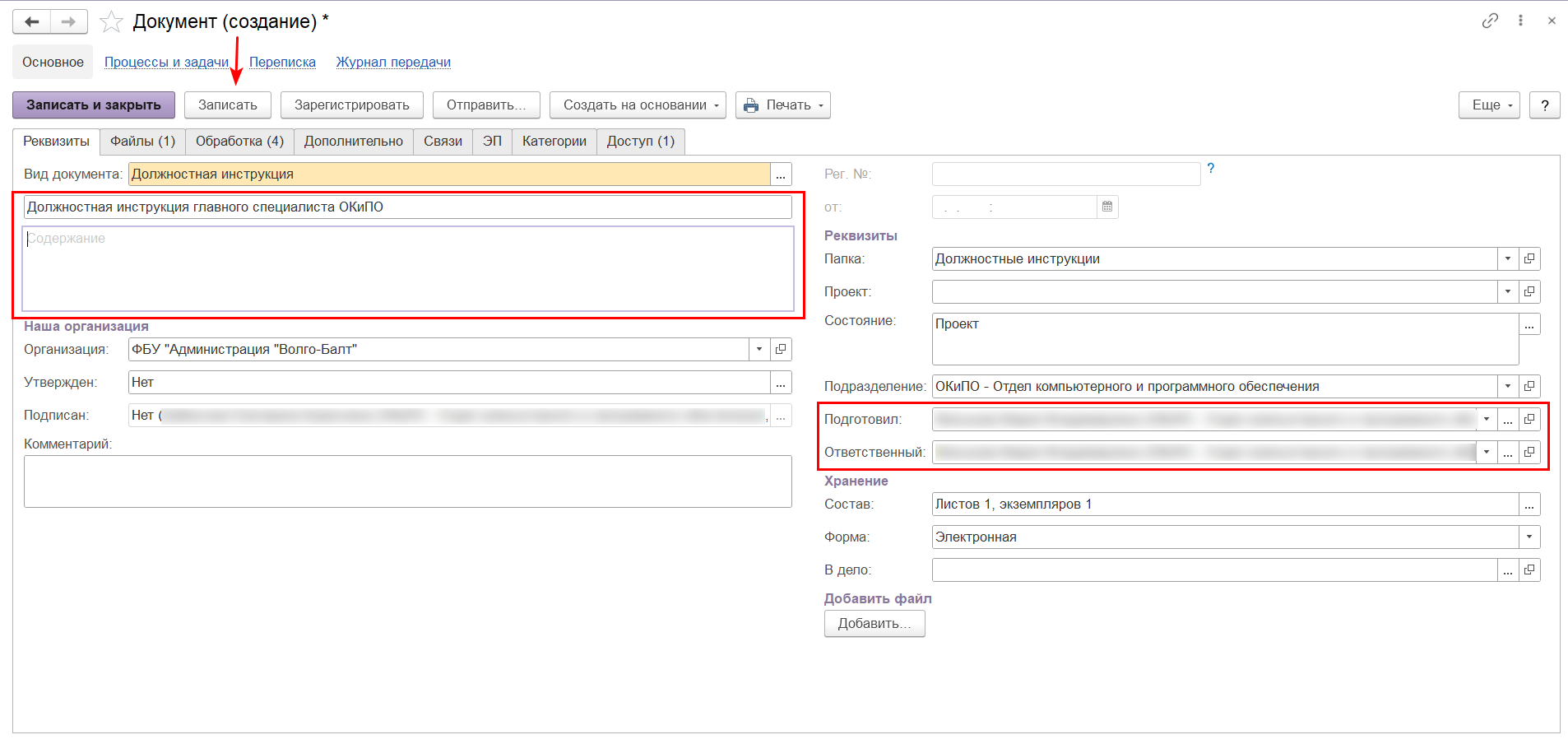 3. В документе обязательно должны быть заполнены поля "Заголовок", "Подготовил" и "Ответственный". На заголовок отводится 150 символов. При необходимости дополнительную информацию можете написать в поле "Содержание" или "Комментарий". По окончании заполнения, нажмите на кнопку "Записать".
