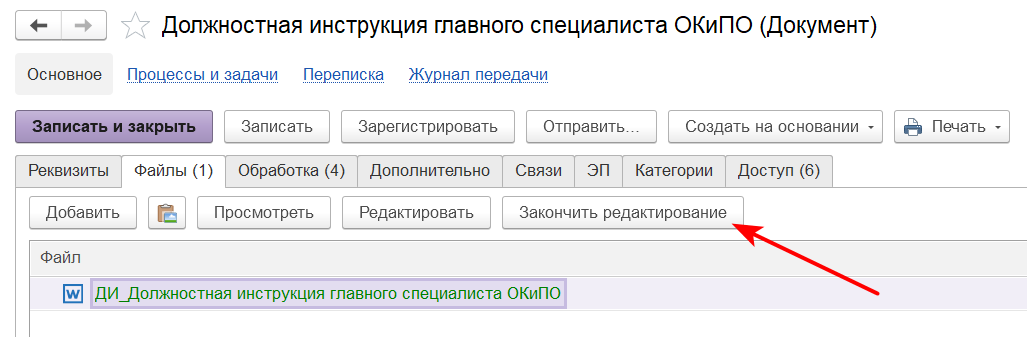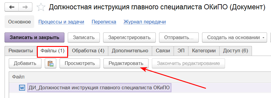 Обращаем ваше внимание, что если вы удалите прикрепленный системой файл из документа, обновите его своим файлом с диска или загрузите свой (вторым файлом, так как в данном виде документа установлен запрет на удаление файлов), то дата утверждения и штампы ЭП не вставятся в ваш файл. Поэтому после создания документа перейдите на вкладку "Файлы" и нажмите "Редактировать".