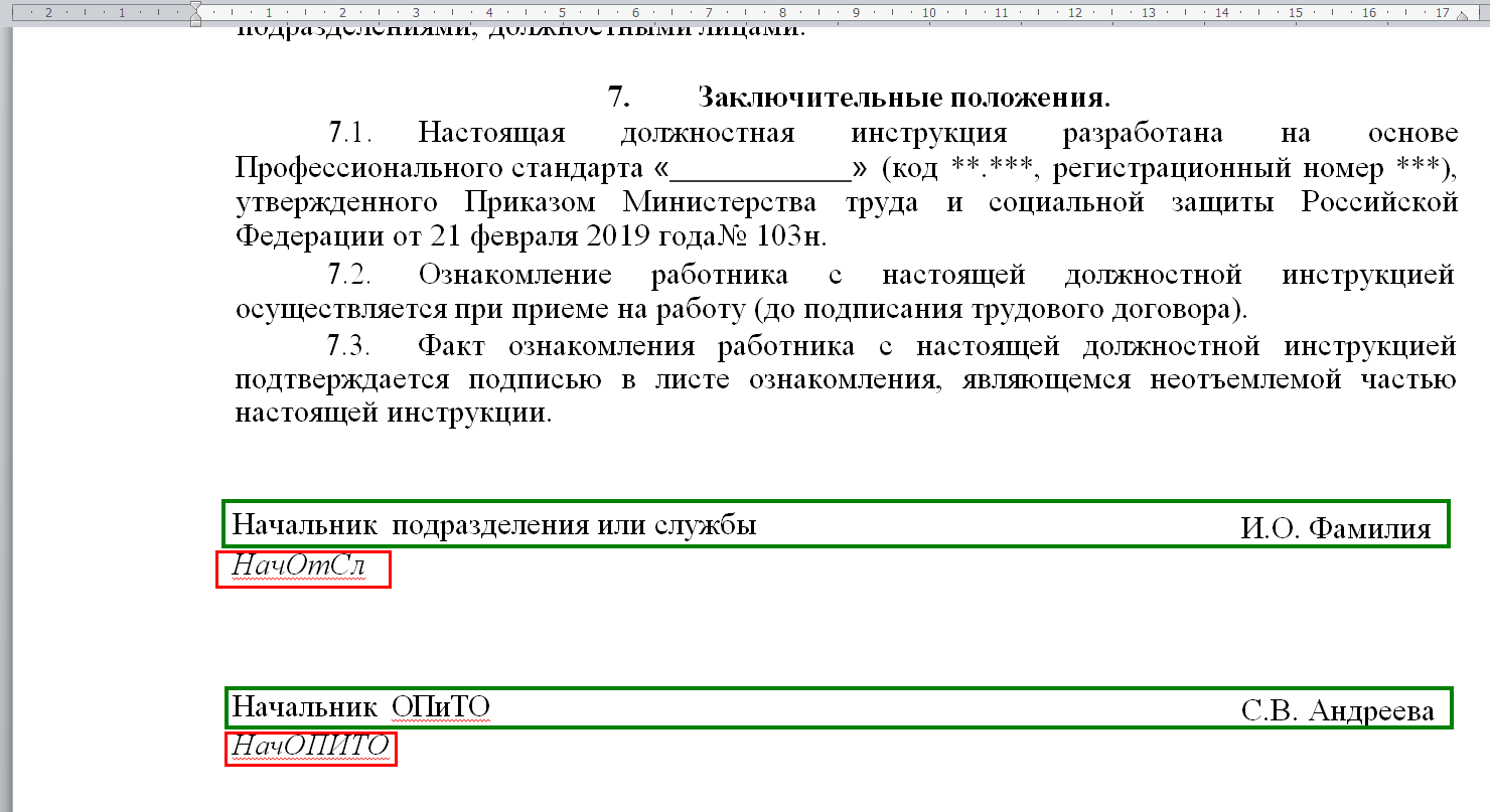 В конце документа вы можете редактировать должности и ФИО подписантов. НЕЛЬЗЯ изменять, удалять строки: "НачОтСл", "НачОПИТО", так как вместо них после завершения подписания всеми участниками при первом открытии файла будут вставлены штампы визуализации ЭП.