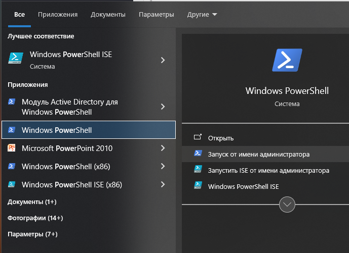 2. Запустите PowerShell (вызовите его через меню «Пуск» от имени администратора):