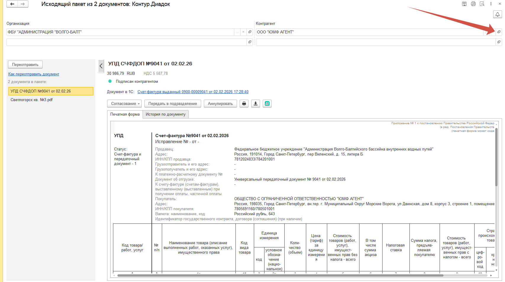 Первым делом нужно зайти в Диадок в 1С: БГУ. Заходим в документы, ранее отправленные контрагенту, которому нужно поменять вид документа.
