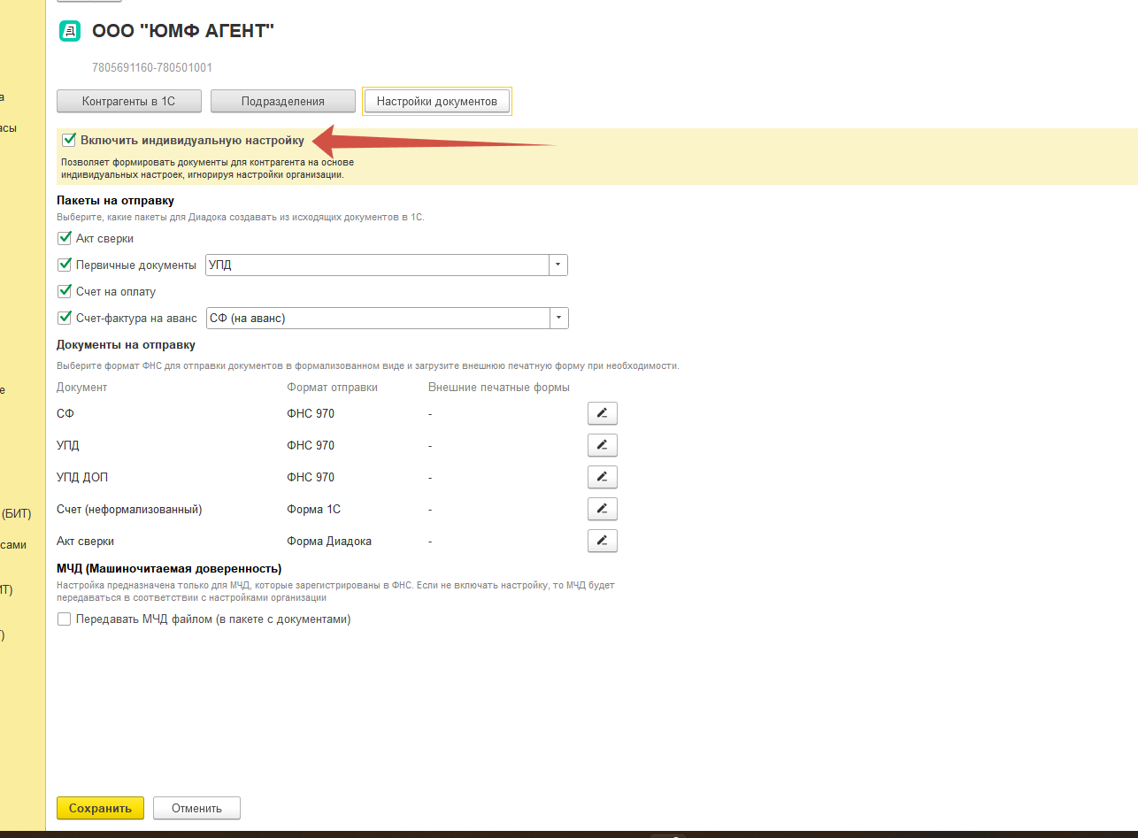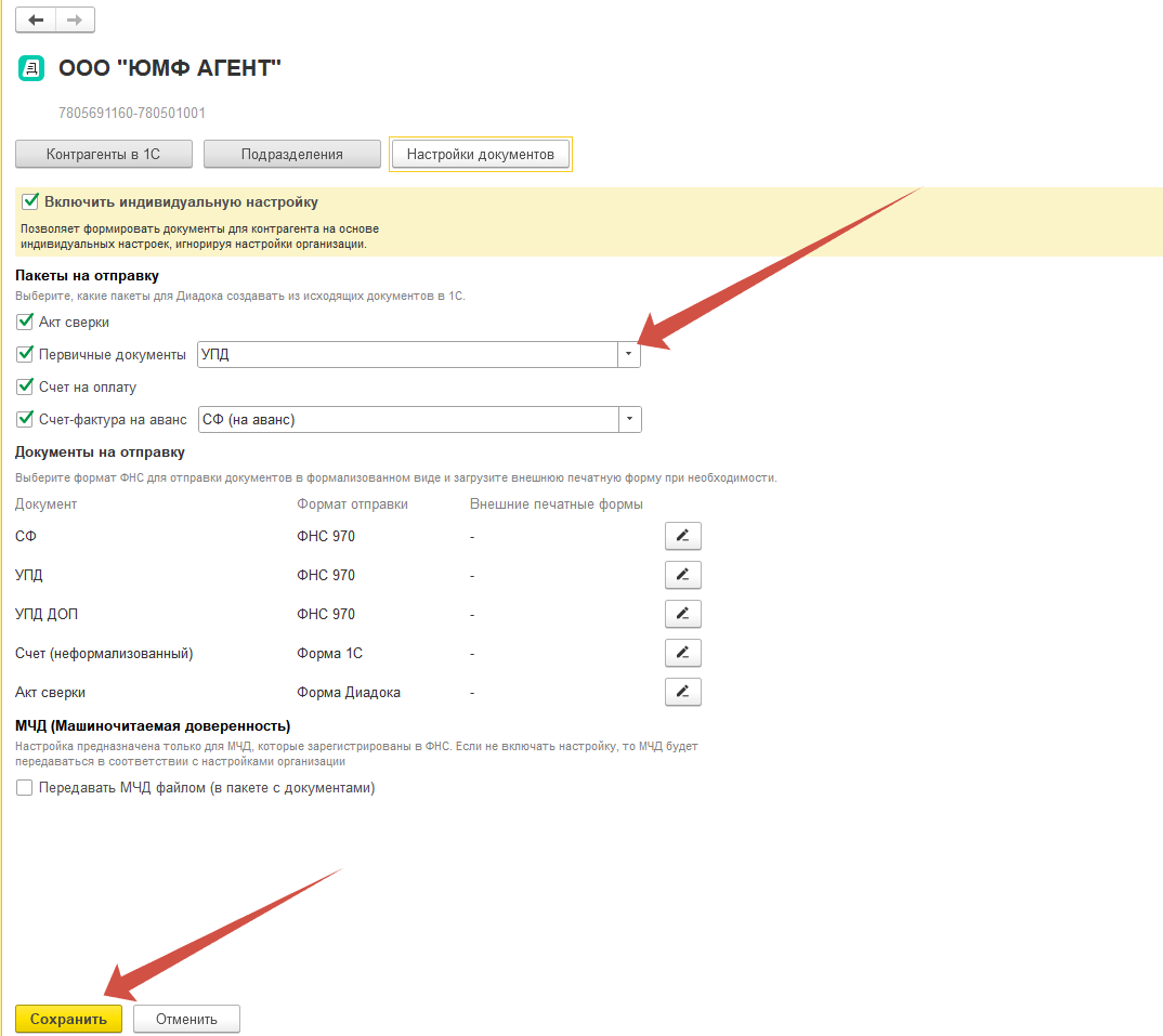 В поле первичный документ выбираем УПД и нажимаем сохранить.